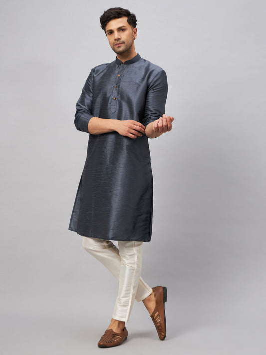 VASTRAMAY Men's Grey Cotton Silk Blend Kurta and Cream Pant Set