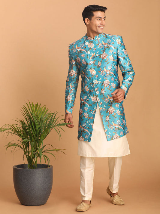 VASTRAMAY Men's Multicolor Base Blue Silk Blend Sherwani With Kurta Pant Set