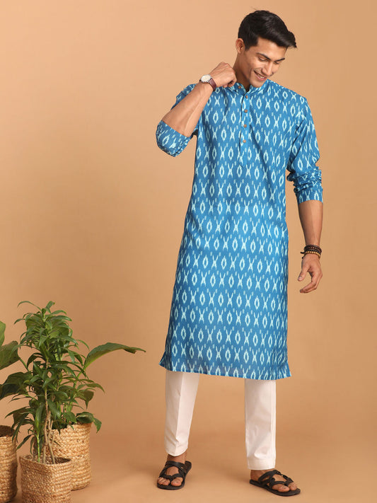 VASTRAMAY Men's Turquoise Blue Ikkat Print Cotton Kurta With Pant set