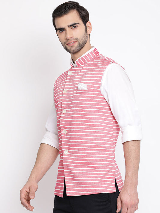 Vastramay Men's Red Stripes And Angrakha Pattern Classic Nehru Jacket