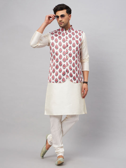 VASTRAMAY Men's Multicolor Printed Ethnic Jacket With Cream Silk Blend Kurta and Pyjama Set