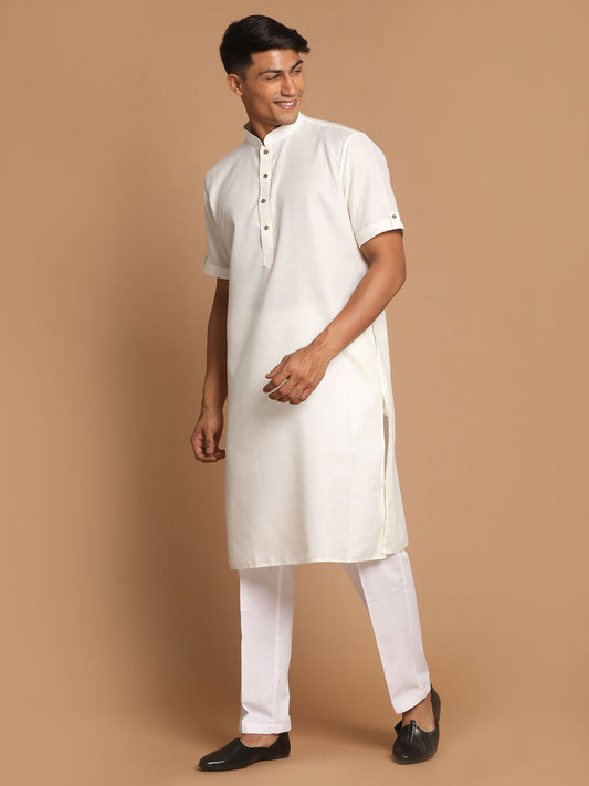 VASTRAMAY Men's Cream Solid Kurta with White Pant style Cotton Pyjama Set