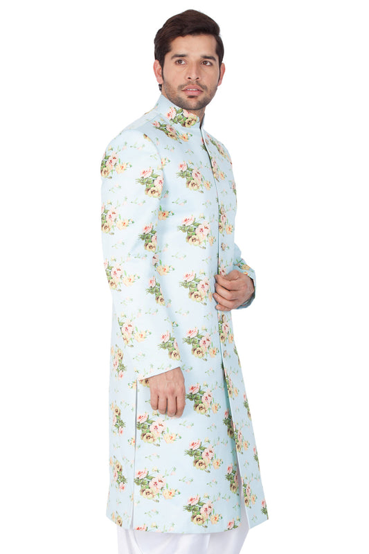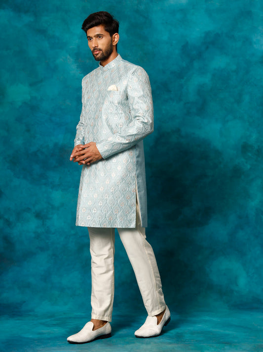 VASTRAMAY Men's Multicolor Base Blue Silk Blend Sherwani With Kurta Pant Set