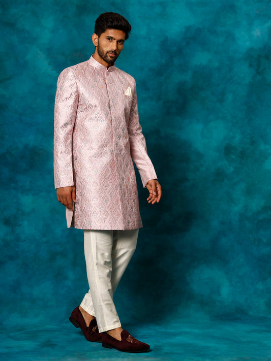 Vastramay Men's Lavender and Off-white Silk Blend Sherwani Set