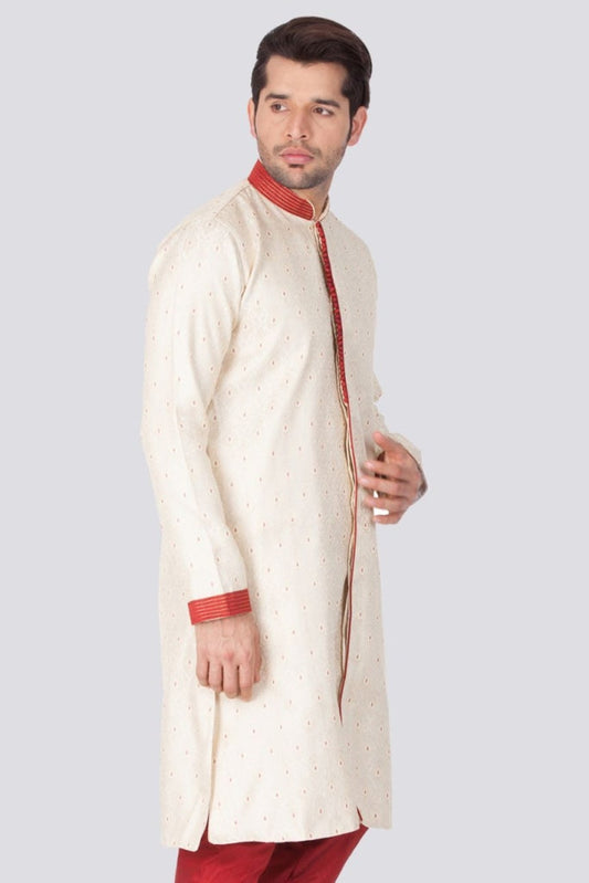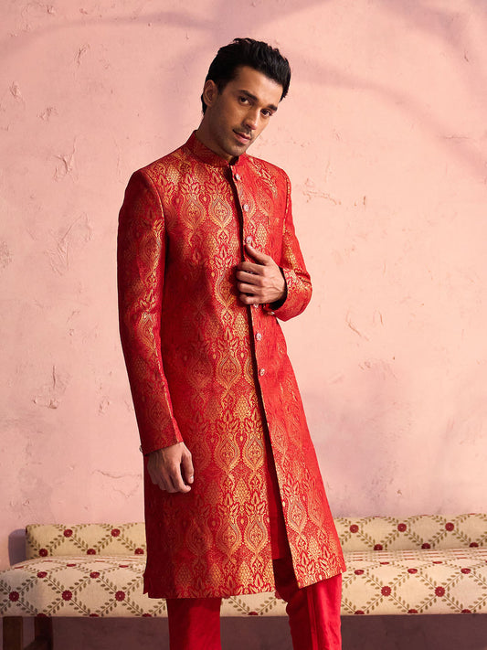 VASTRAMAY Men's Red Jacquard Sherwani Only Top