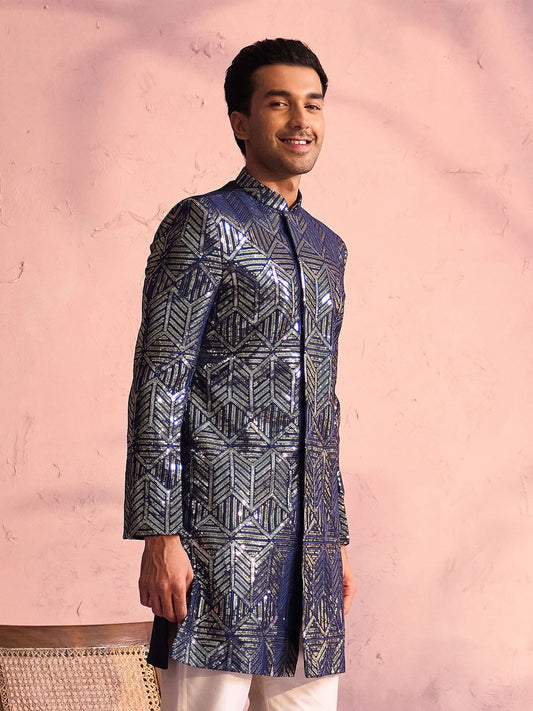 VASTRAMAY Men's Navy Blue Georgette Sherwani Only Top