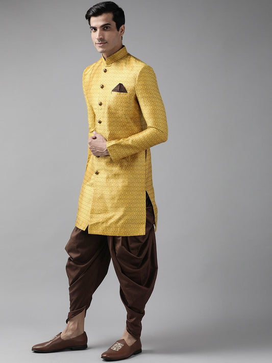 Vastramay Men's Mustard Yellow And Coffee Silk Blend Sherwani Set