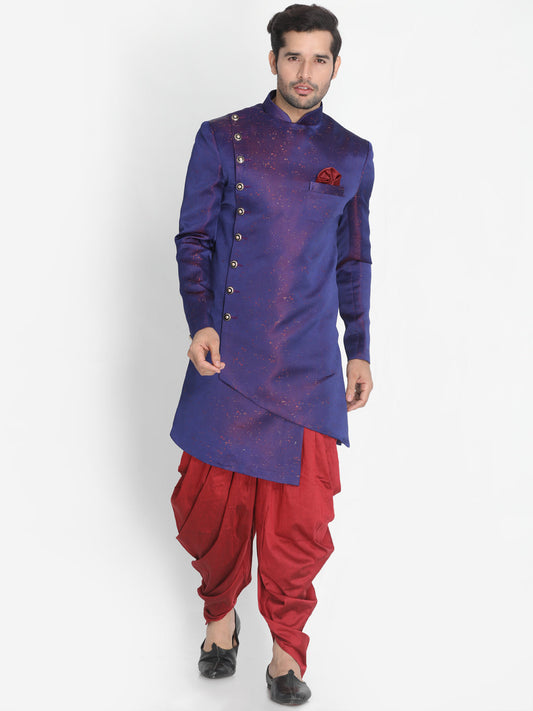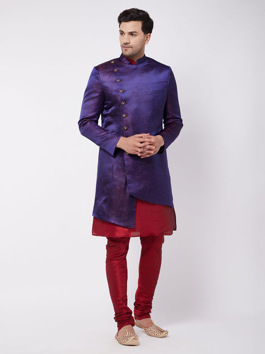 Vastramay Men's Purple Angrakha Style Indo Western Over Maroon Kurta Pyjama Set