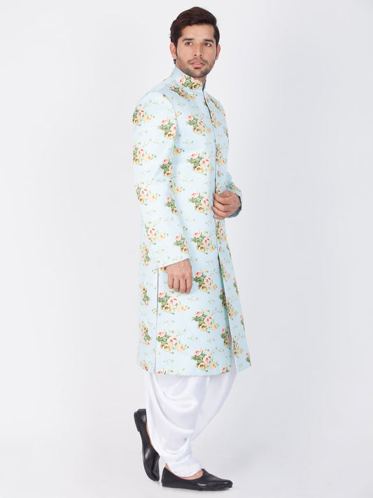 Vastramay Men's Green Base Multicolor Cotton Blend Sherwani Set