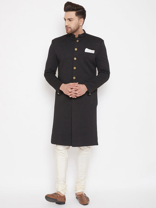 Vastramay Men's Black Cotton Blend Sherwani Set