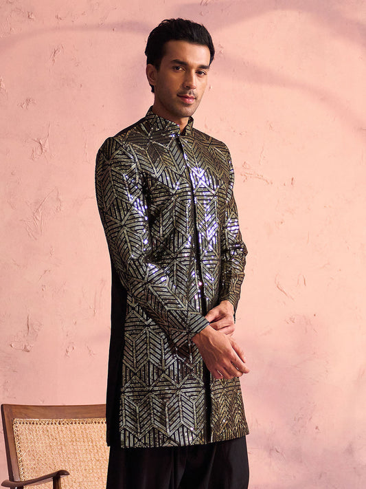 Vastramay Men's Black Georgette Sherwani Only Top