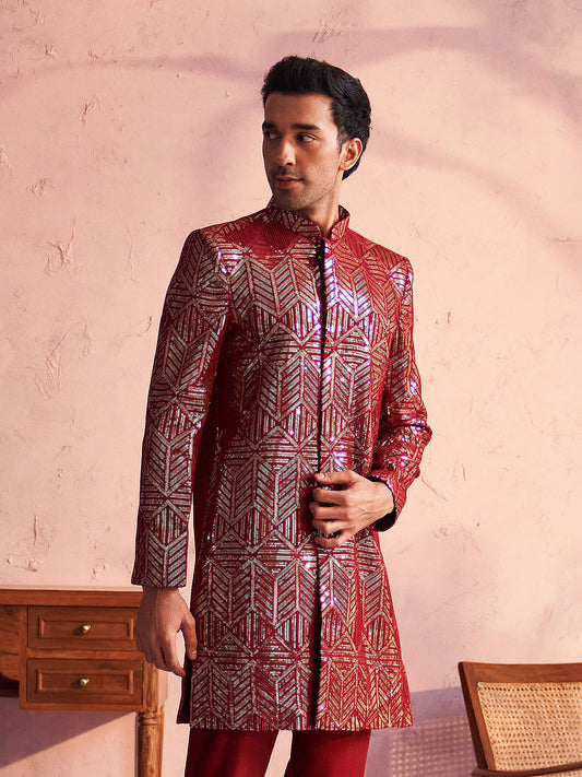 Vastramay Men's Maroon Georgette Sherwani Only Top