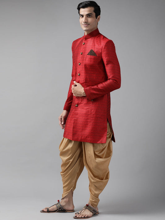 Vastramay Men's Maroon And Rose Gold Silk Blend Sherwani Set