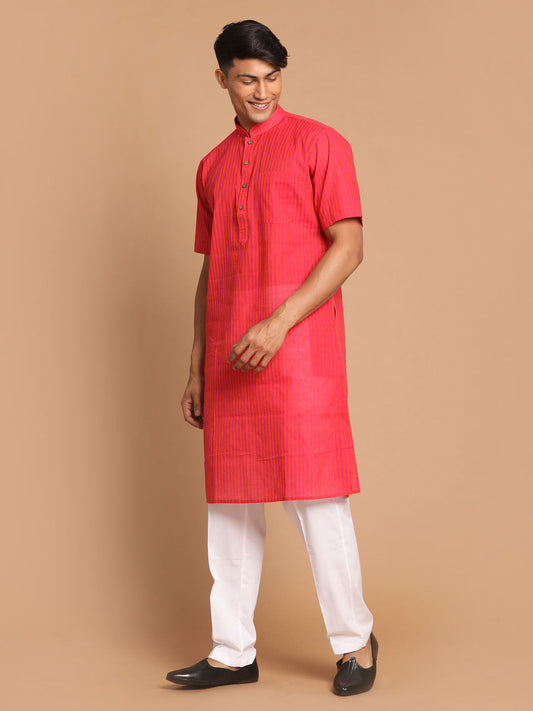 Vastramay Men's Pink Striped Cotton Kurta With White Pyjama Set