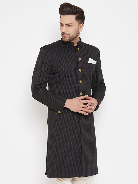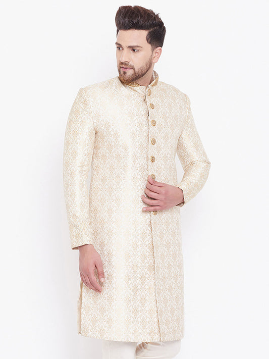 Vastramay Men's Beige And Gold Embroidered Brocade Sherwani Top