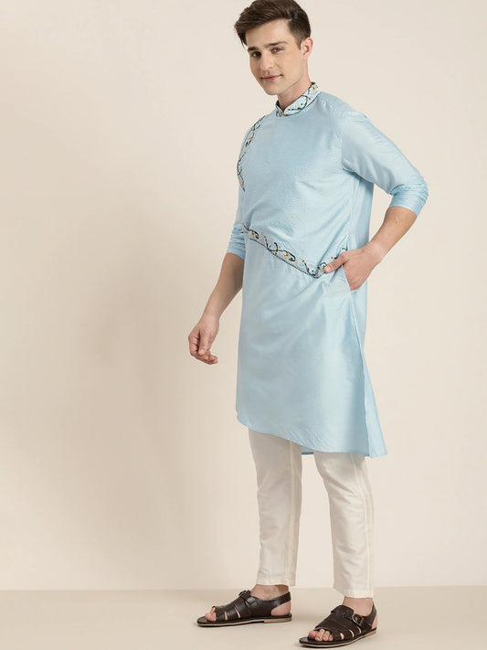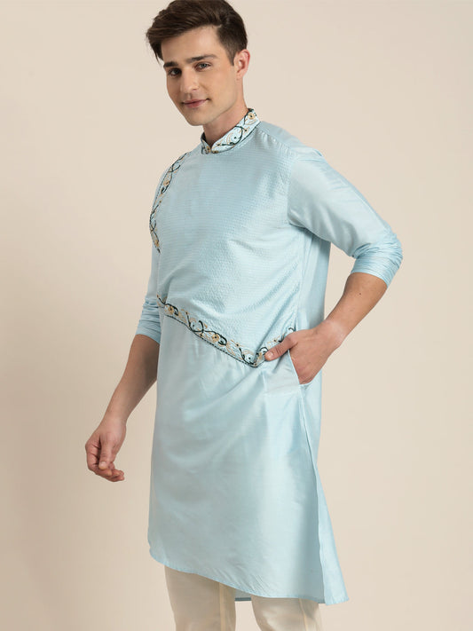 Vastramay Men's Aqua Blue Tread Work Kurta
