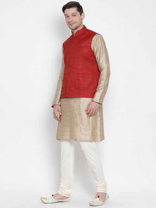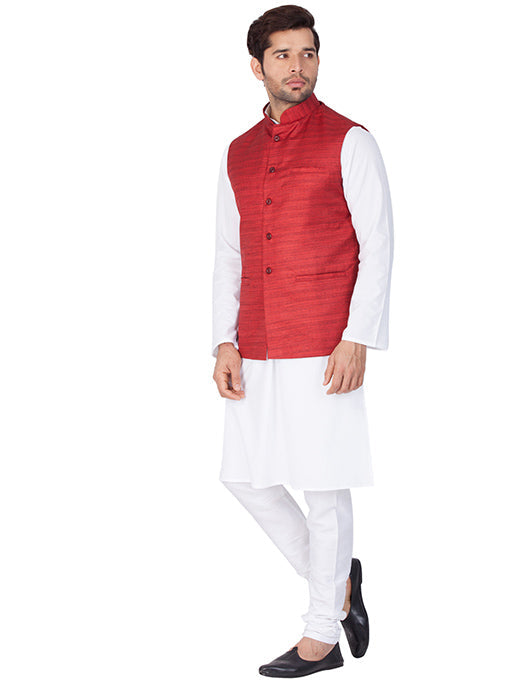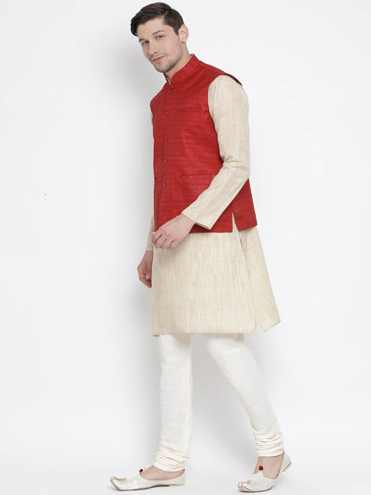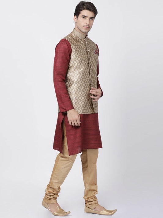 Vastramay Men's Maroon Cotton Silk Blend Kurta, Ethnic Jacket and Pyjama Set