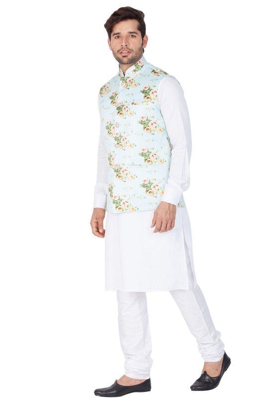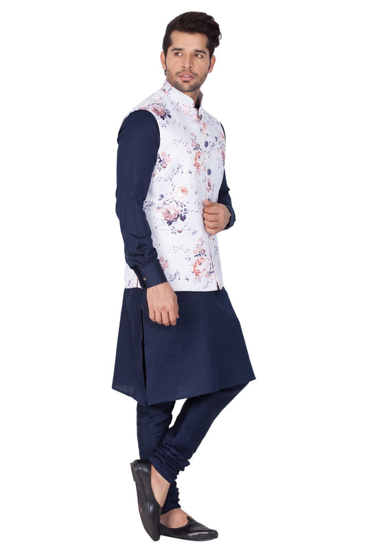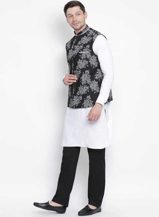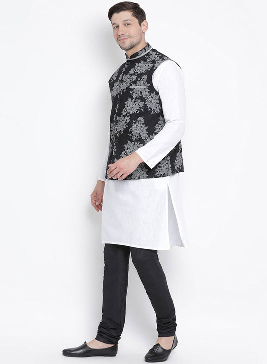 Vastramay Men's White Cotton Blend Kurta, Ethnic Jacket and Pyjama Set