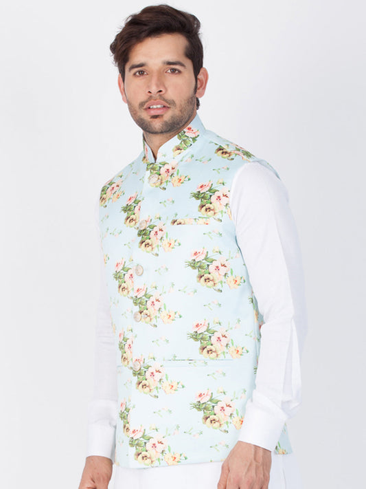 Vastramay Men's Blue Cotton Blend Kurta, Ethnic Jacket and Pyjama Set