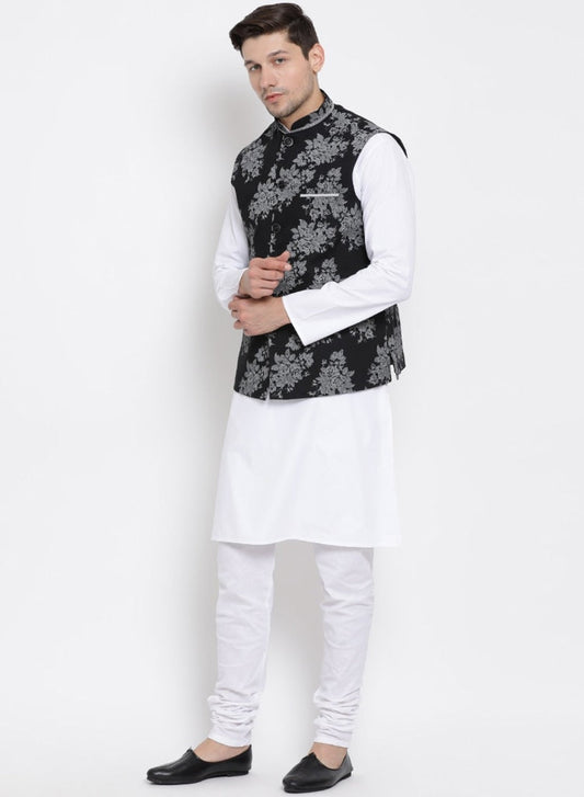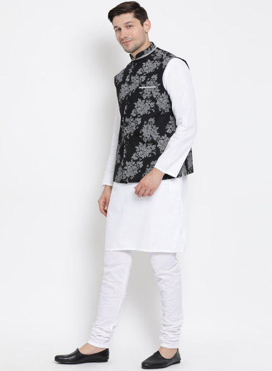 Vastramay Men's White Cotton Blend Kurta, Nehru Jacket and Pyjama Set