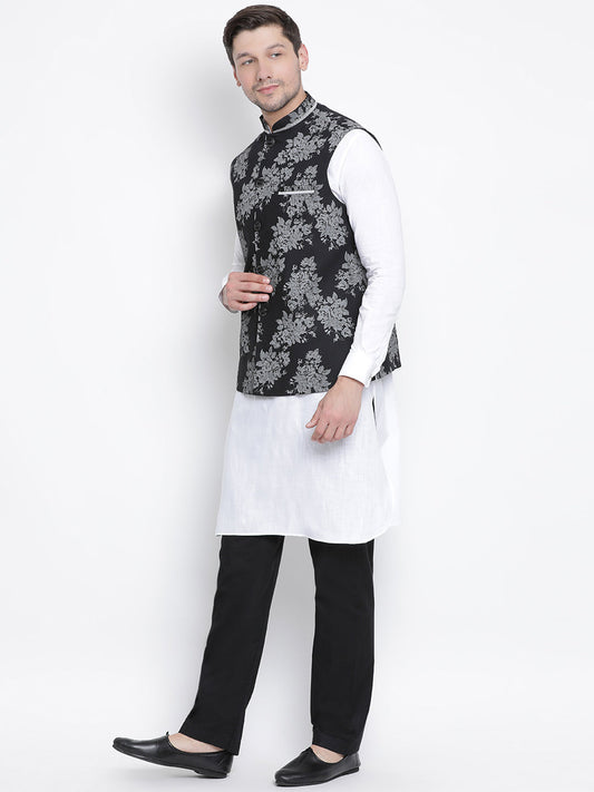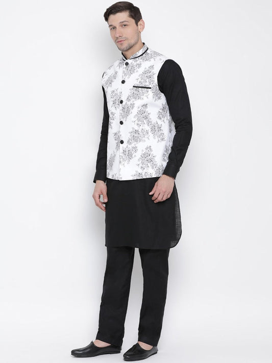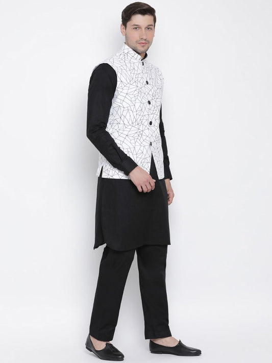 Vastramay Men's Black Cotton Blend Kurta, Ethnic Jacket and Pyjama Set