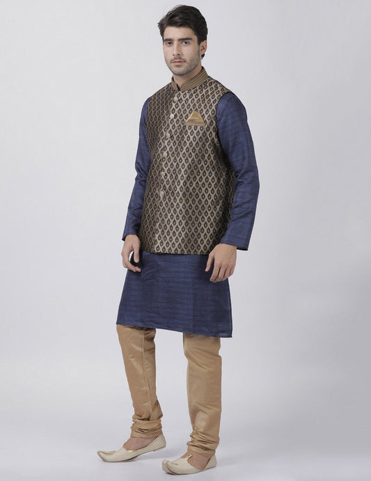 Vastramay Men's Dark Blue Cotton Silk Blend Kurta, Ethnic Jacket and Pyjama Set