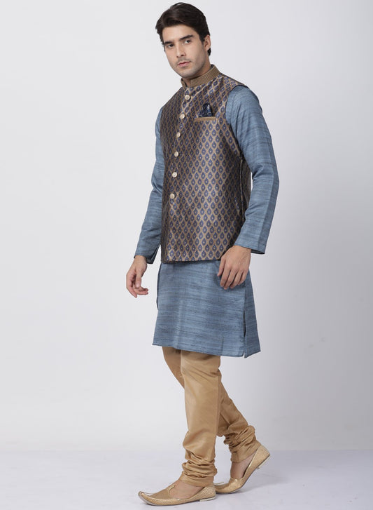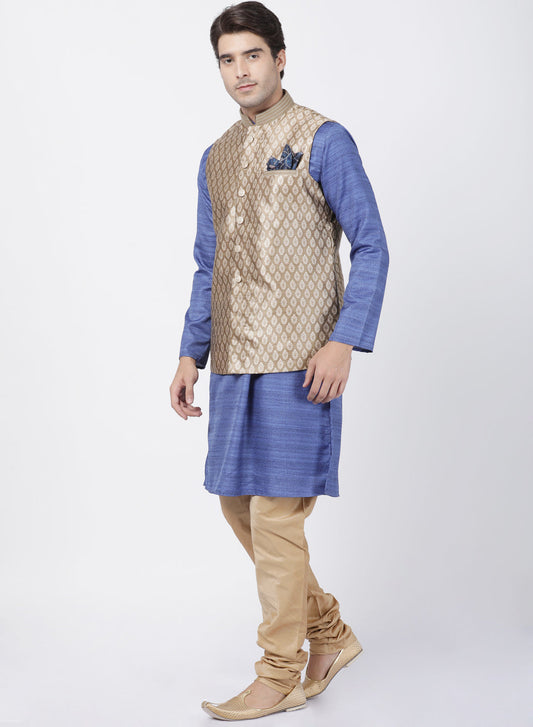 Vastramay Men's Blue Cotton Silk Blend Kurta, Ethnic Jacket and Pyjama Set