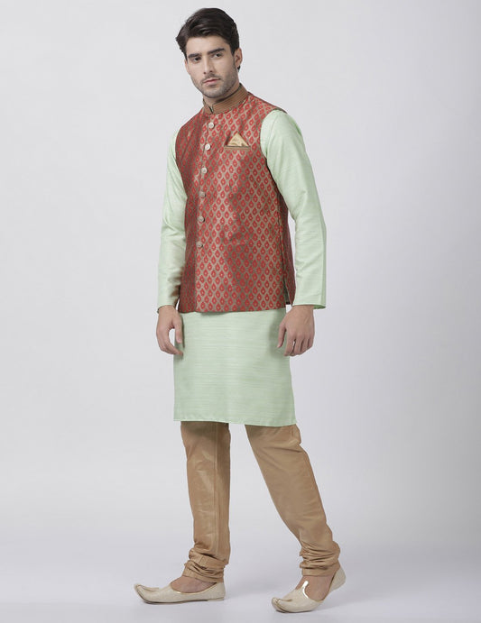 Vastramay Men's Light Green Cotton Silk Blend Kurta, Ethnic Jacket and Pyjama Set