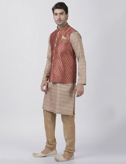 Vastramay Men's Beige Cotton Silk Blend Kurta, Ethnic Jacket and Pyjama Set