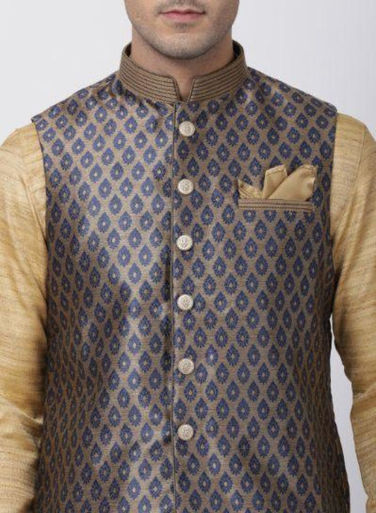 Vastramay Men's Gold Cotton Silk Blend Kurta, Ethnic Jacket and Pyjama Set