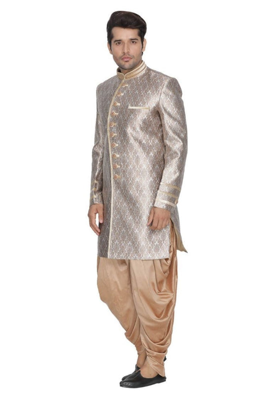 Vastramay Men's Gold Cotton Silk Blend Sherwani Set