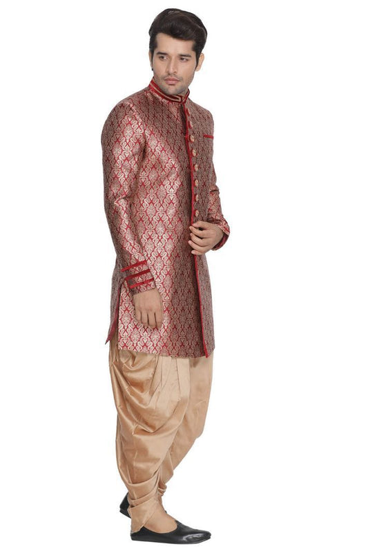 Vastramay Men's Maroon Cotton Silk Blend Sherwani Set