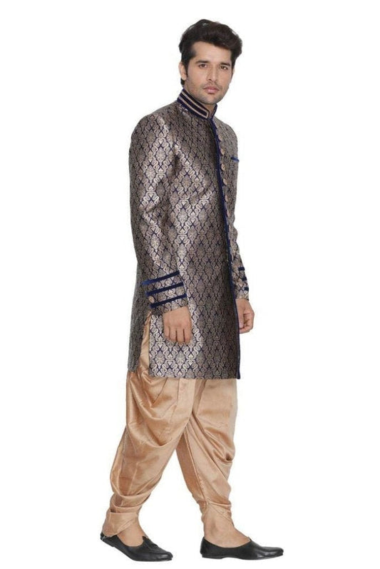 Vastramay Men's Navy Blue Imported Jacquard Self Design Sherwani Set
