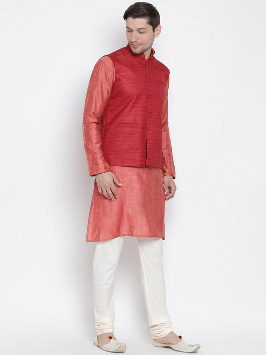 Vastramay Men's Pink Cotton Silk Blend Kurta, Ethnic Jacket and Pyjama Set