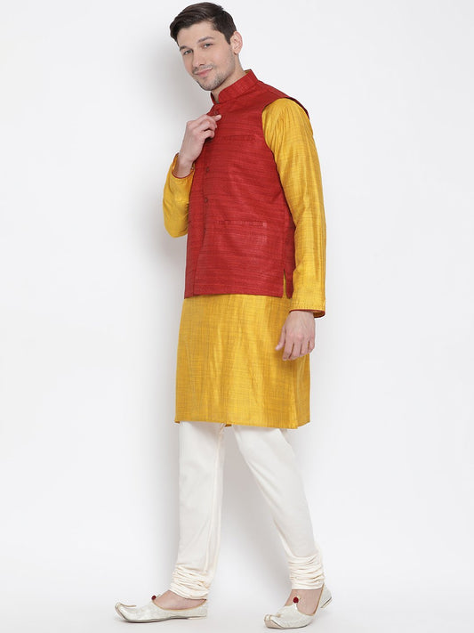 Vastramay Men's Yellow Cotton Silk Blend Kurta, Ethnic Jacket and Pyjama Set
