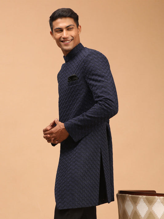 Vastramay Men's Navy Blue imported Jacquard Self Design Sherwani Only Top
