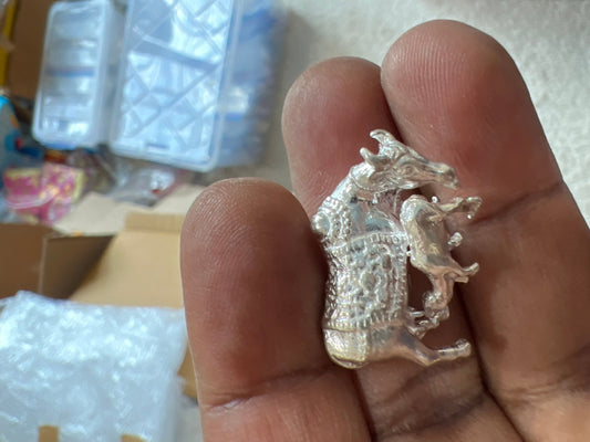 Silver idols are typically small figurines or statues made primarily of silver. They often depict religious, cultural, or mythological figures and are crafted with intricate details to highlight their significance. Silver idols can vary in size from tiny handheld pieces to more oversized decorative items meant for altars or display. They are valued not only for their artistic craftsmanship but also for their symbolic meaning in various traditions and belief systems worldwide. These idols may be used in religious rituals, as offerings, or as decorative pieces in homes and temples, symbolizing devotion, spirituality, and cultural heritage. The craftsmanship in creating silver idols often involves skilled artisans specializing in metalwork, ensuring each piece is unique and carries a sense of reverence and beauty.