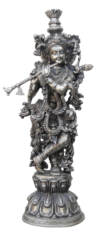 Brass Krishna Statue With Silver Antique Finish