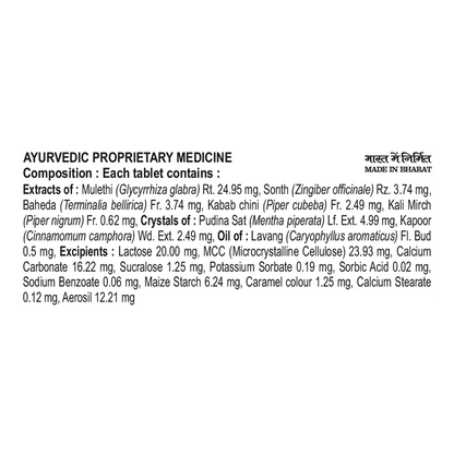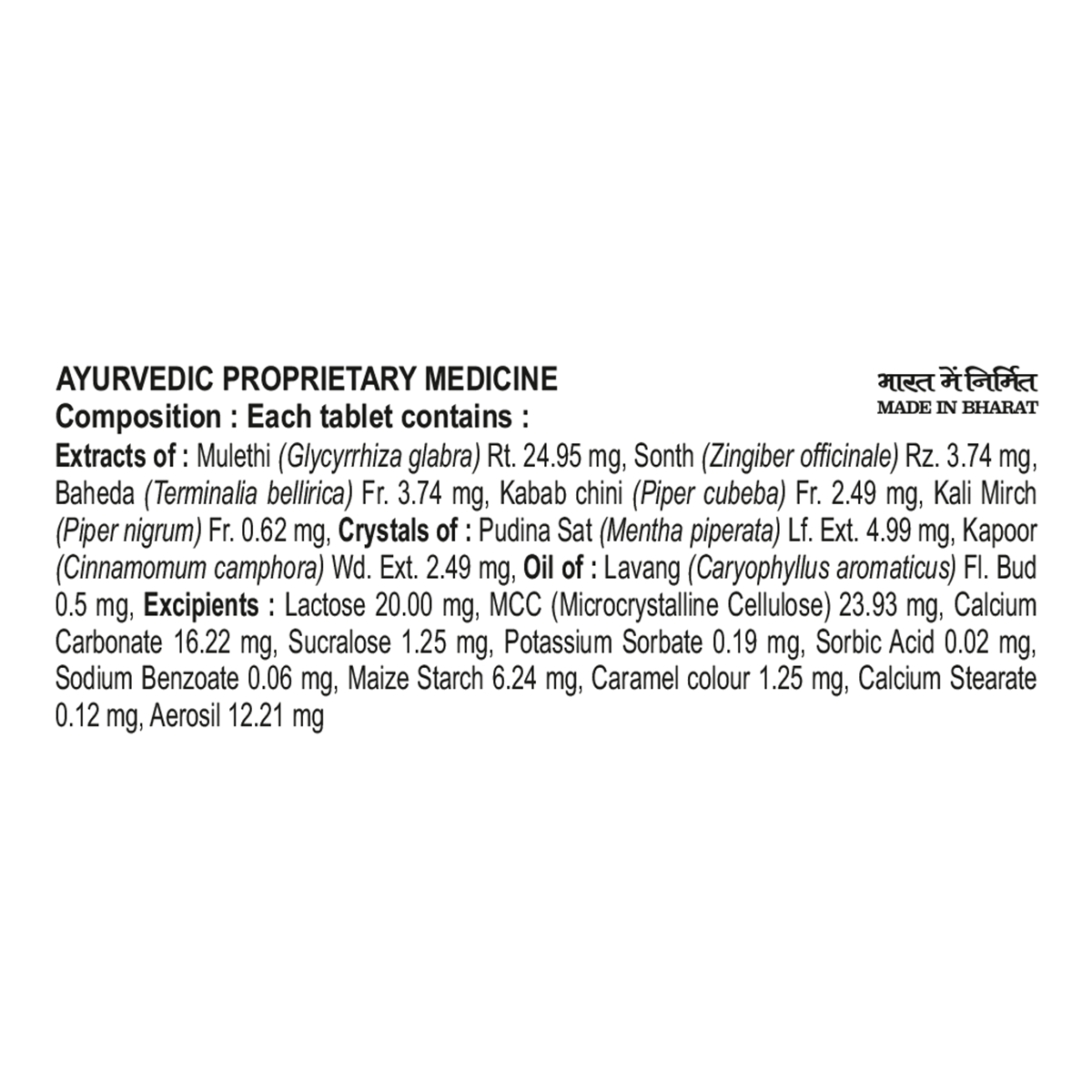 Divya Kanthamrit Chewable Tablet is useful in cold, cough, throat infections, and bronchitis. Kanthamrit contains Mulethi, Sounth, Pudina sat as ingredients.