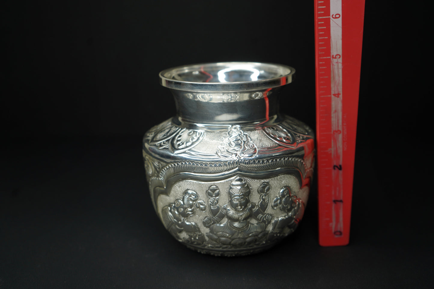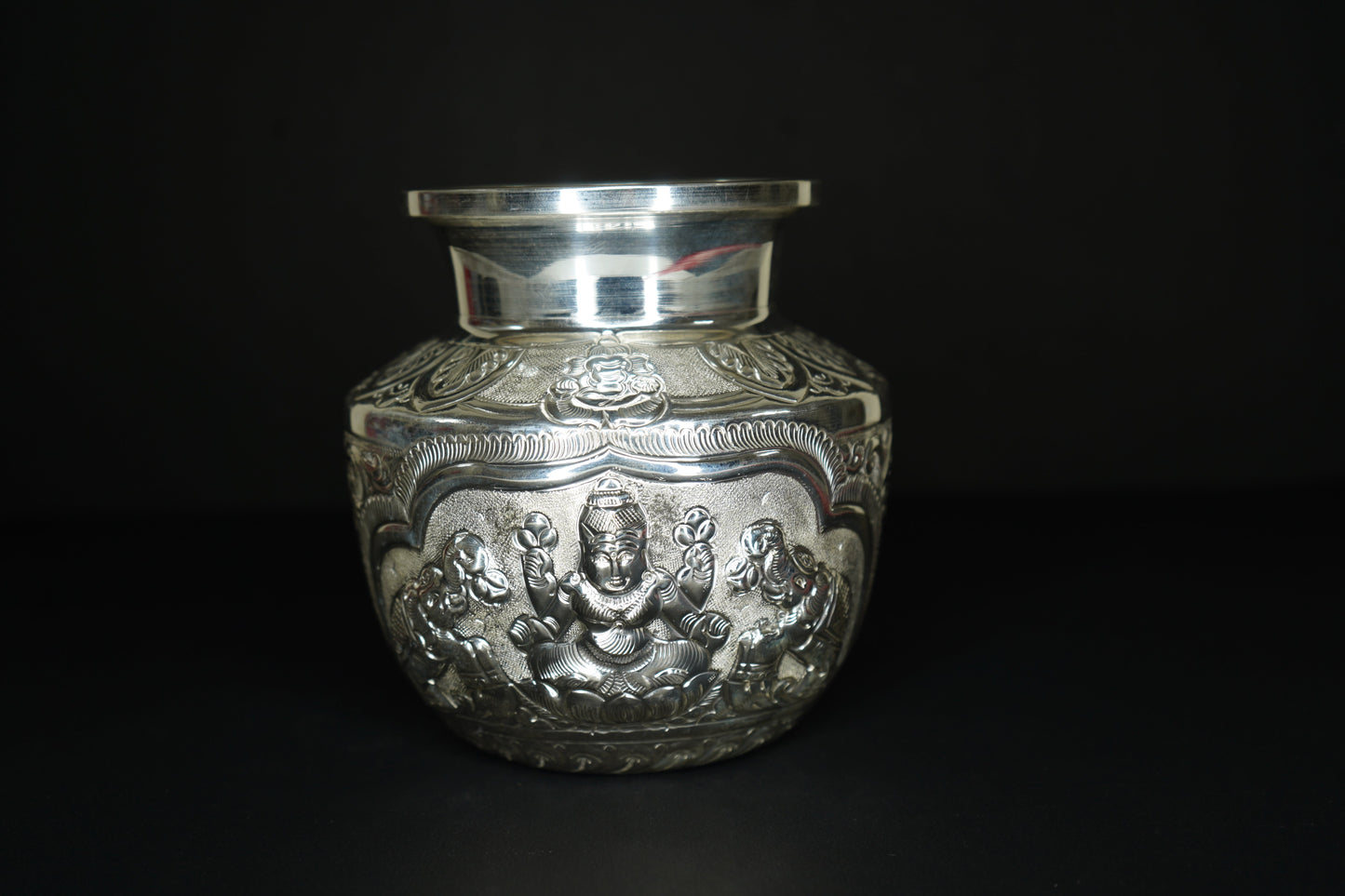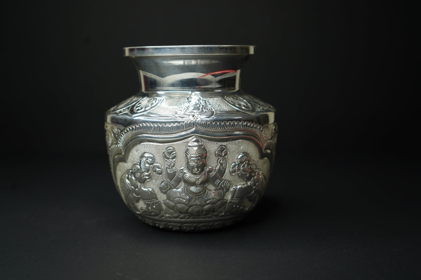 The "Silver Ashtalakshmi Kalash with Elephant" is a sacred and ornate item in Hindu culture, symbolizing prosperity, abundance, and divine blessings.