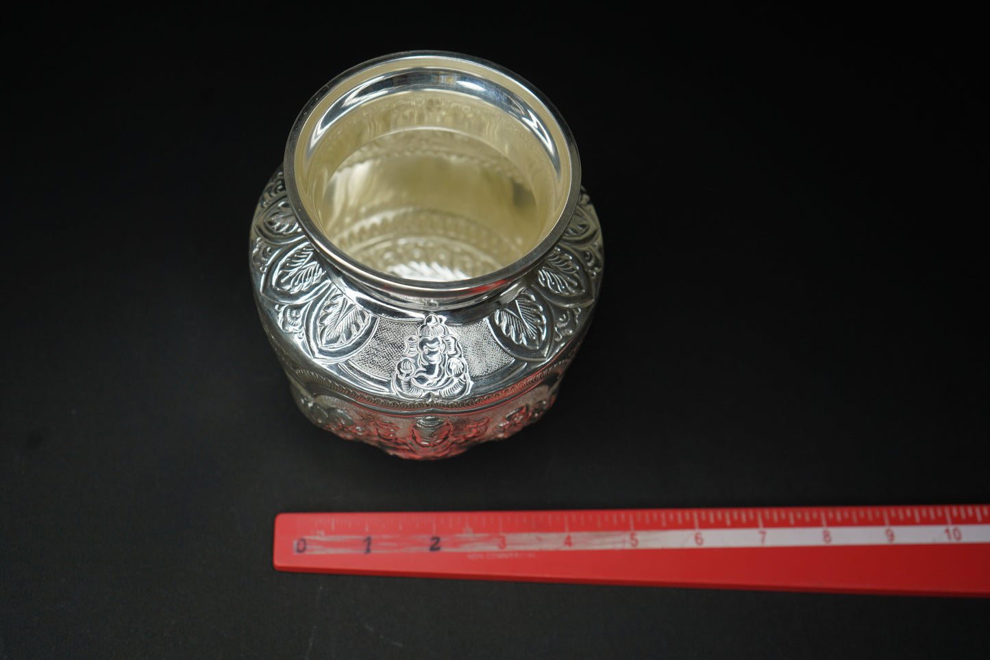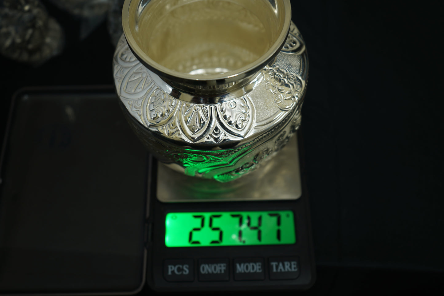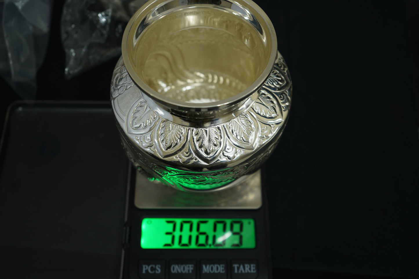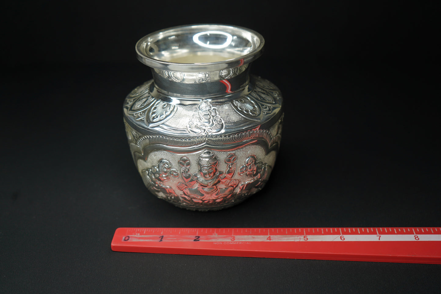 The "Silver Ashtalakshmi Kalash with Elephant" is a sacred and ornate item in Hindu culture, symbolizing prosperity, abundance, and divine blessings.