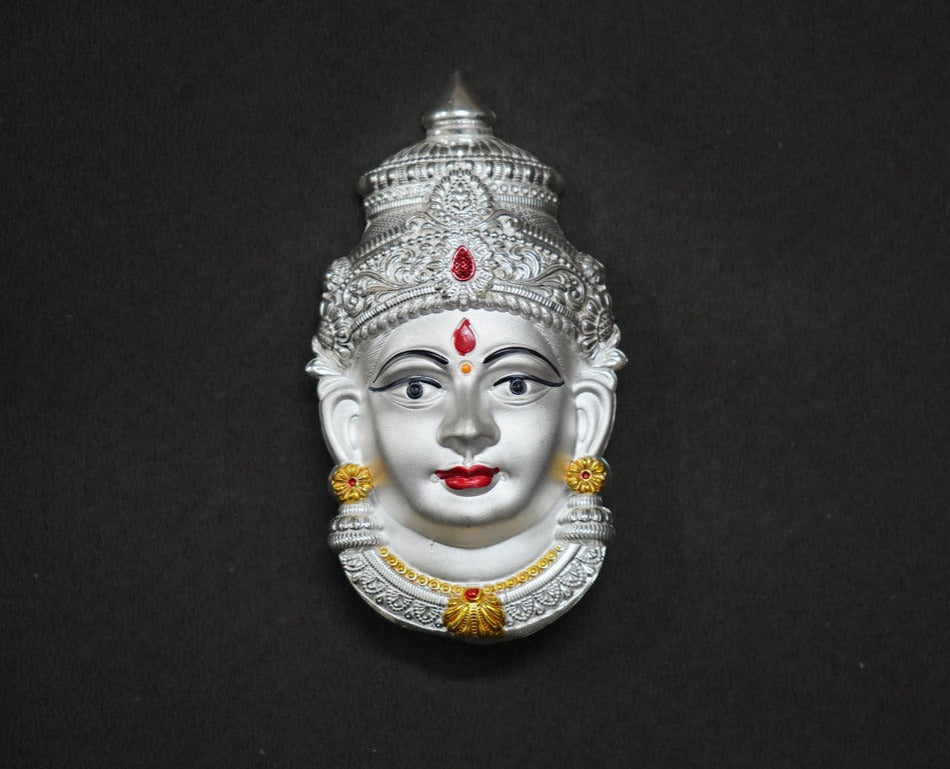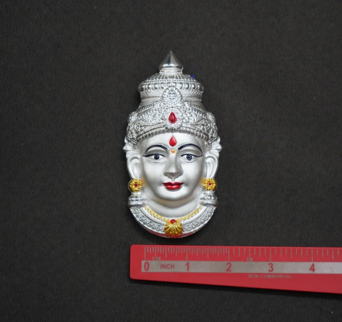 Pure Silver Lakshmi Mukhavada is made of 92.5% silver purity. Available in 3.8 inch face sizes and has hooks at the back to tie the face. These Idols were crafted in clay by Skilled and Reputed Sculptors and then converted into silver form. It can be kept in a pooja room or given to friends and family. perfect for worship places as well as special occasions/festivities.