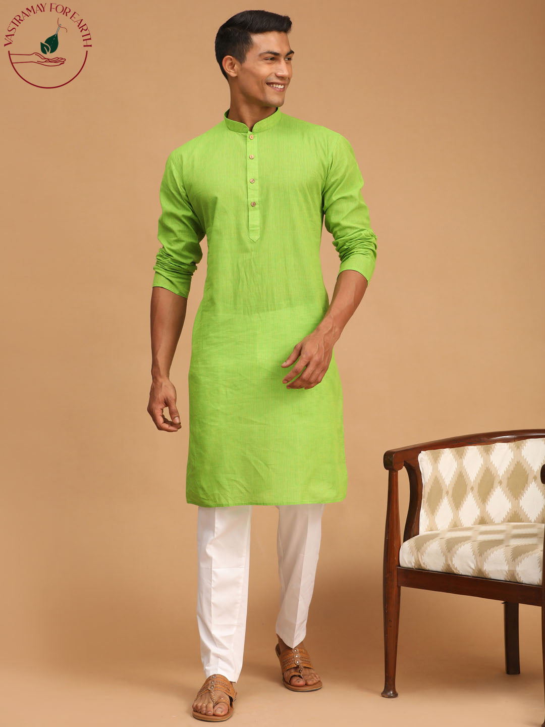 Vastramay Men's Green Cotton Handloom Kurta With White Pant Set