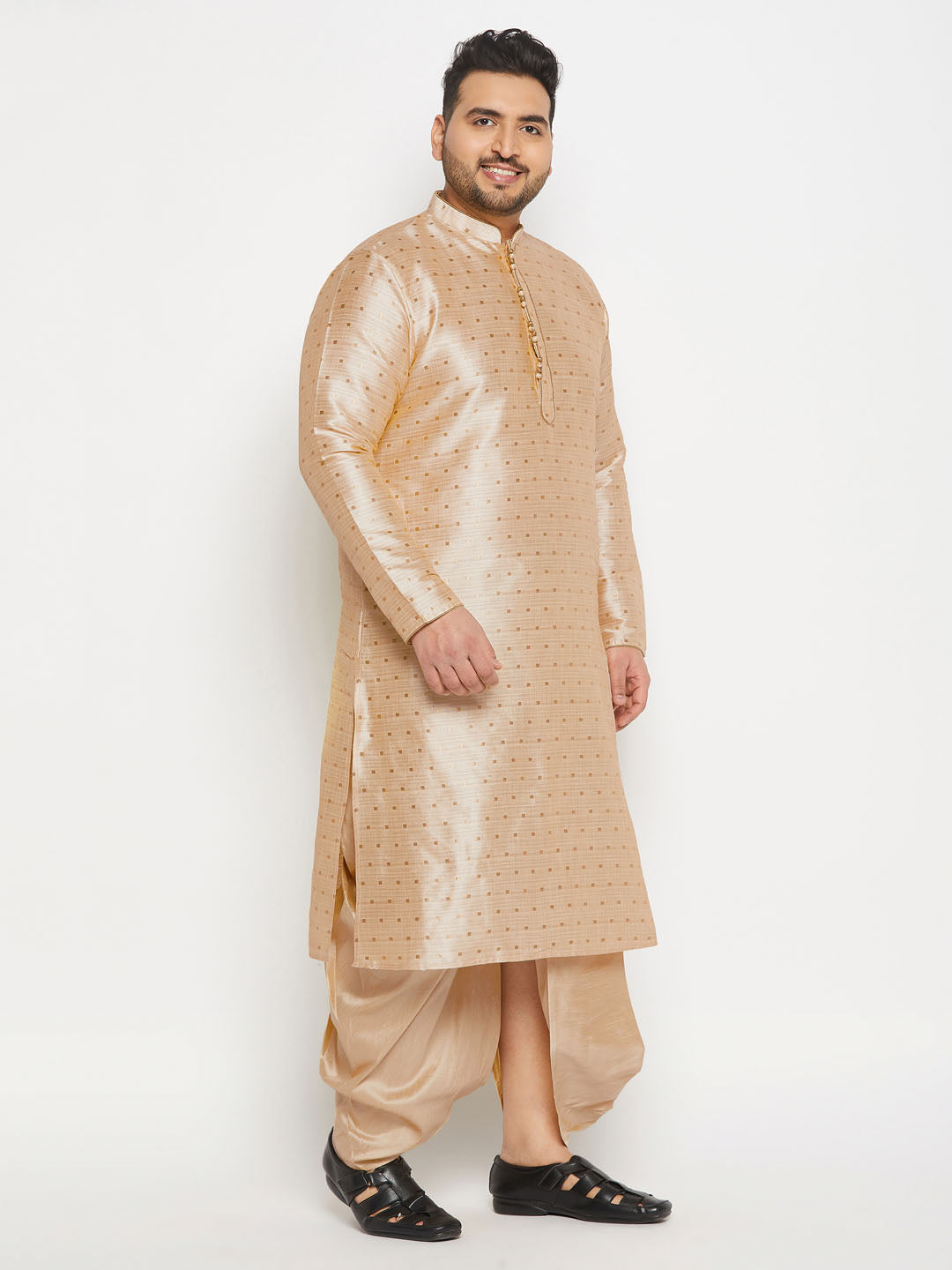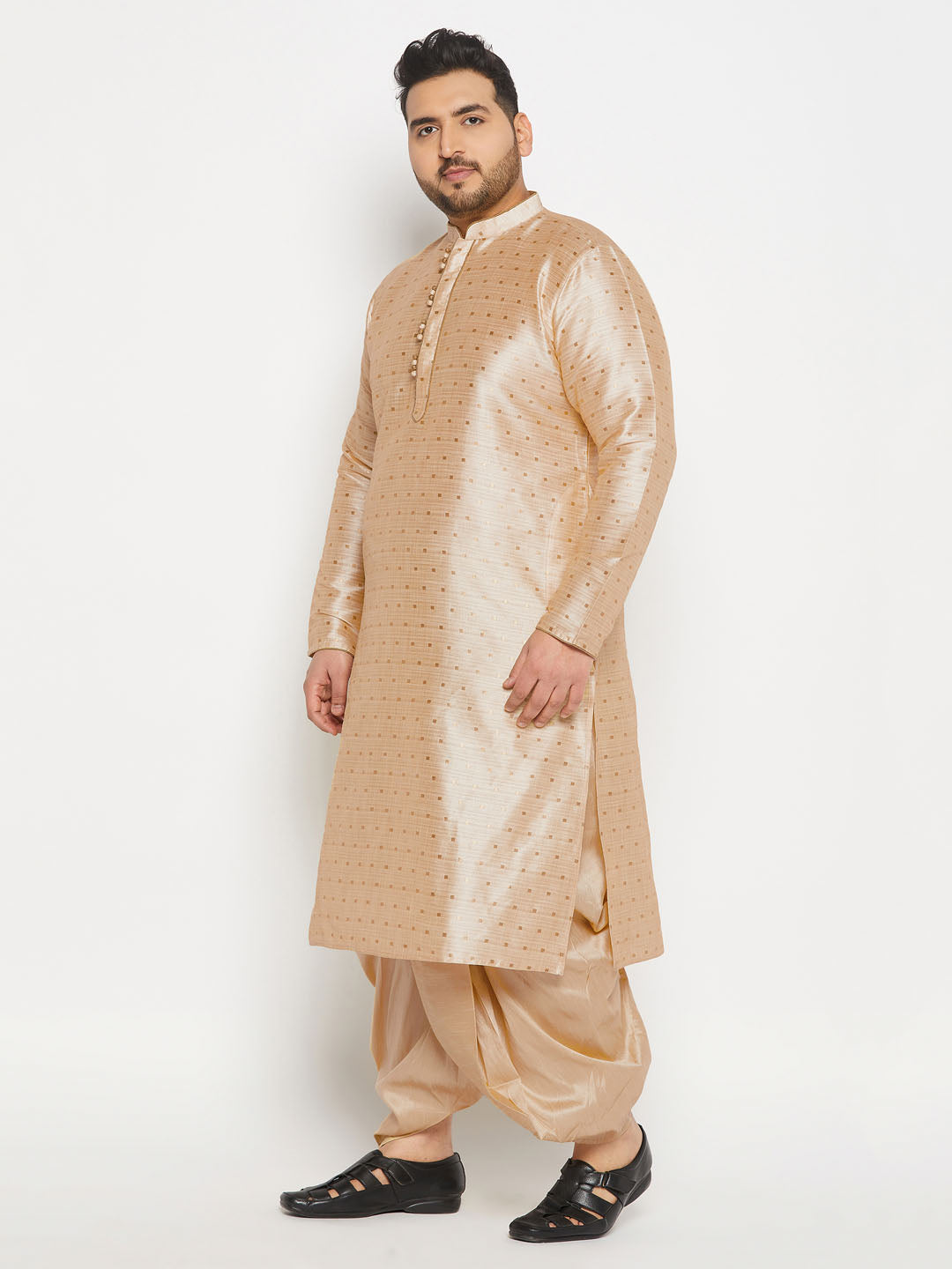 Vastramay Men's Plus Size Gold Zari Weaved Kurta Dhoti Set