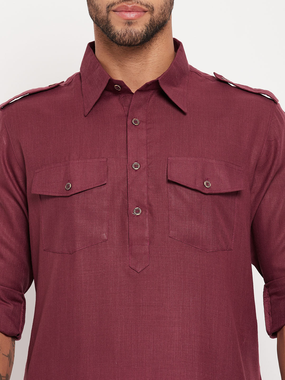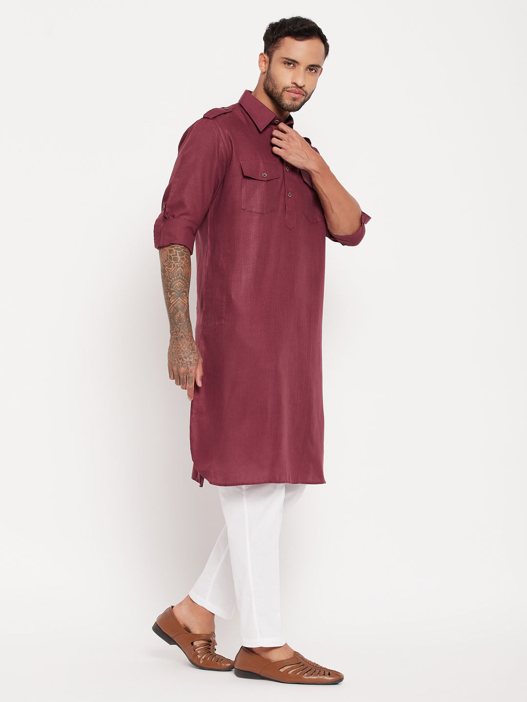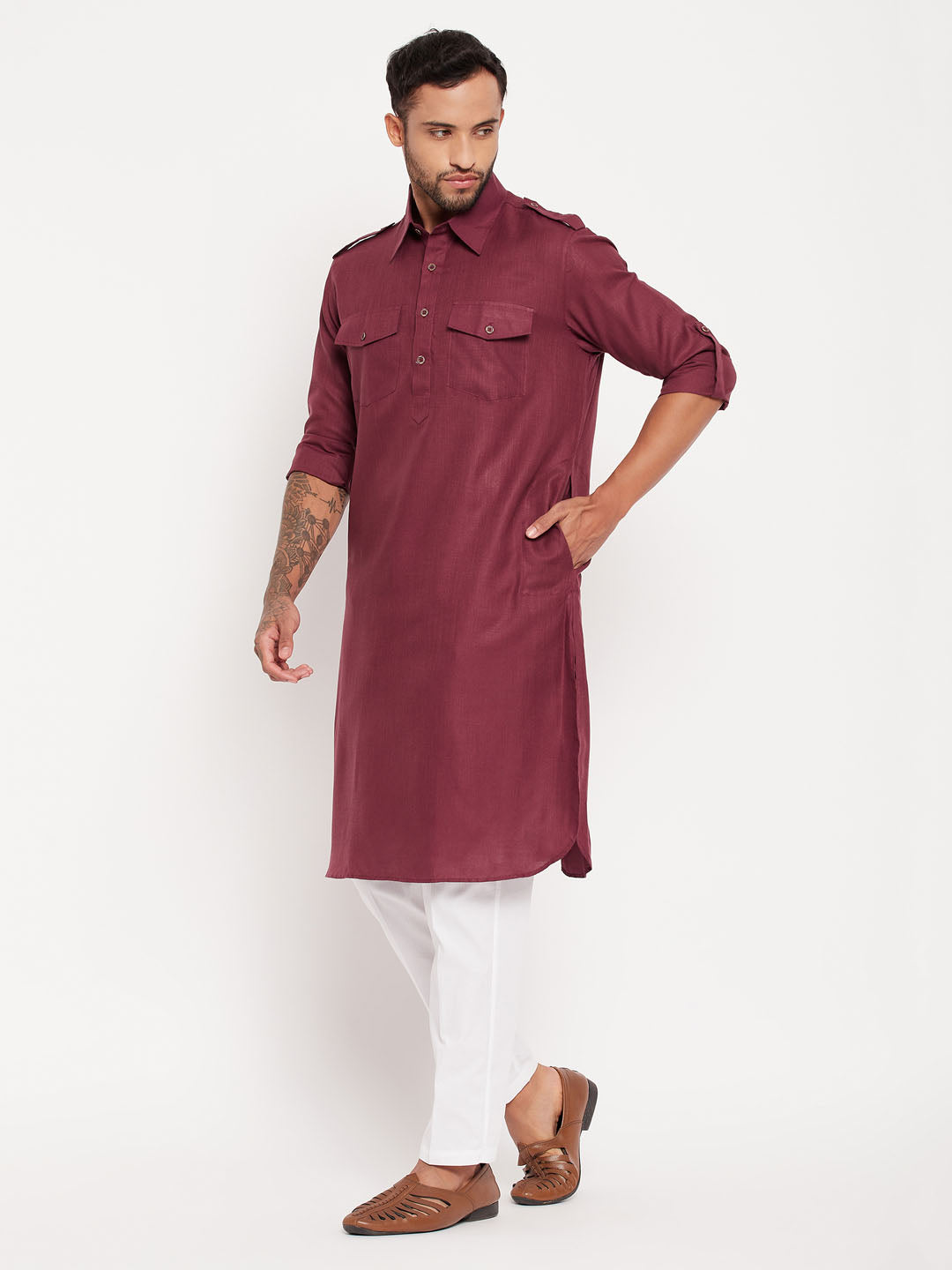 Make a statement with this elegant Pathani suit set. The rich purple color adds a touch of royalty, while the white pants provide a crisp contrast. Perfect for weddings, festivals, or special occasions, this outfit is sure to turn heads. Crafted from high-quality fabric, it offers both style and comfort.
